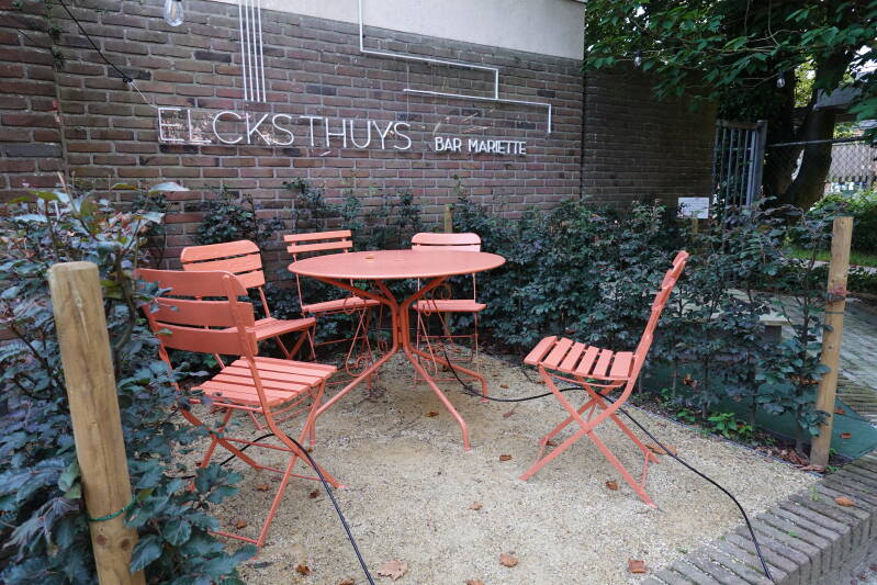 Bar Mariette doet intrede in het ontmoetingscentrum Elcks Thuys. De voortuin, oorspronkelijk volledig beplant met blokhagen wordt omgevormd tot terras. De oorspronkelijke blokhagen worden vervangen door eigentijdse beplanting. Voor een knus gevoel op het terras worden er hagen voorzien. Onder de kersenboom krijgen varens, elfenbloem en hortensia's een beschutte plek. In de border midden krijgt een Japanse esdoorn de kans om de show te stelen, samen met een wintergroene wolk van Osmanthus.