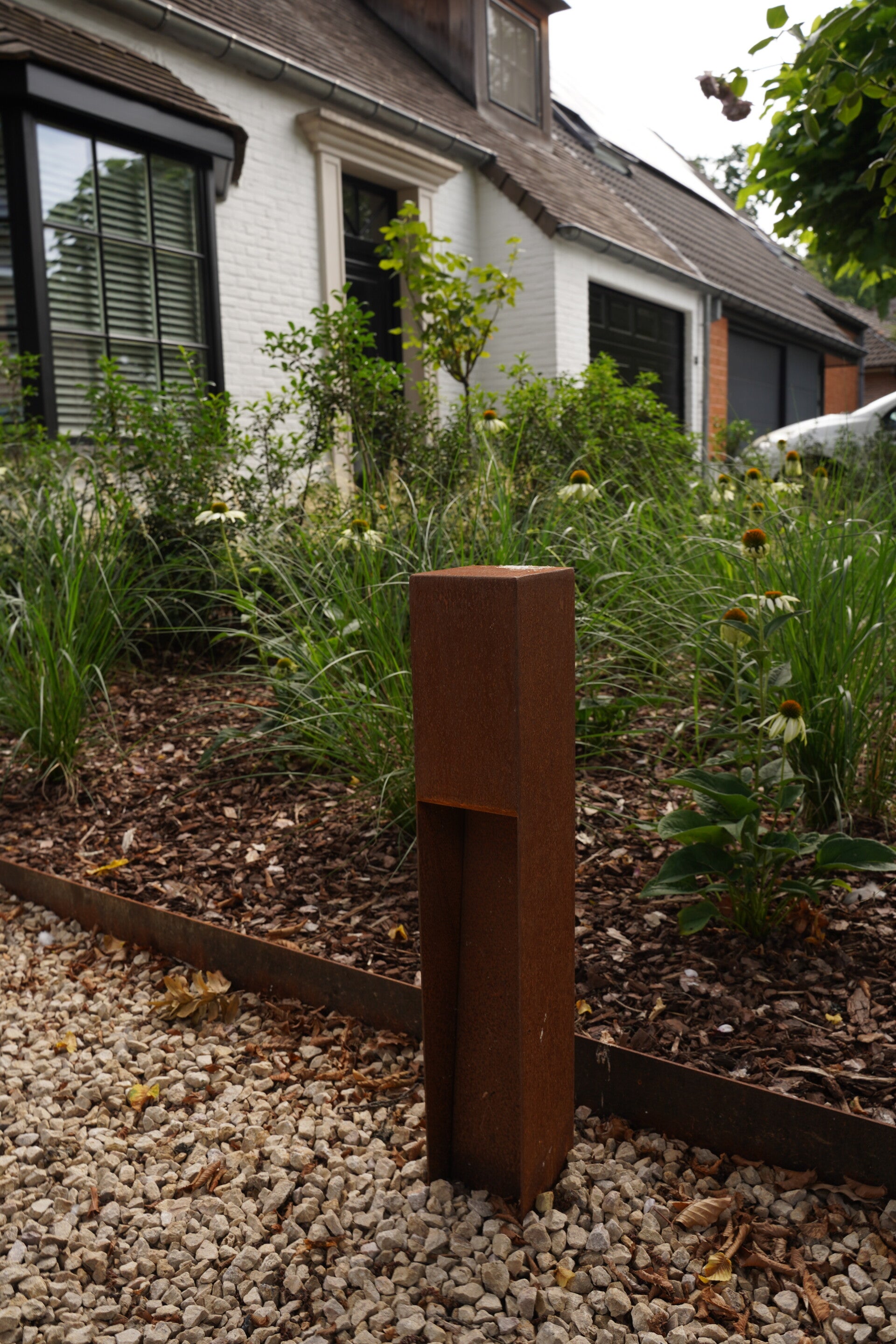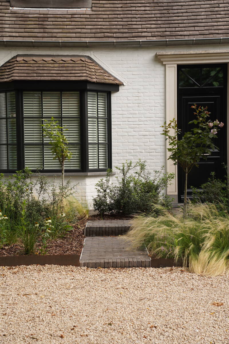 Oorspronkelijk wilde men enkel de "buxustuin" vernieuwen. De verharding zou men op termijn nog wel vervangen ... niets mis met een recht pad naar de voordeur toch? Het oorspronkelijk hellend pad naar de voordeur is na mijn advies toch vervangen door een pad met treden. Dit pad werd bewust niet pal voor de voordeur geplaatst. Het huidige pad ligt tussen de borders in waardoor de weg naar de voordeur een "tuinbeleving" wordt. Wintergroene Osmanthus vormt het geraamte van deze tuin. Deze plant komt op verschillende plaatsen terug wat rust geeft in de tuinbeleving. De keuze van vaste planten is beperkt gehouden. Twee verschillende siergrassen bloeien op een verschillend tijdstip. Salvia zorgt voor bloemen vroeg in de zomer terwijl de Echinacea later in de zomer straalt. Stamrozen geven hoogte aan de tuin. De borders zijn afgebakend met cortenstaal en ook de verlichting links is voorzien in cortenstaal. Grondspots verlichten de gevel en het boompje naast het huis. Deze tuin is ook 's avonds een streling voor het oog.